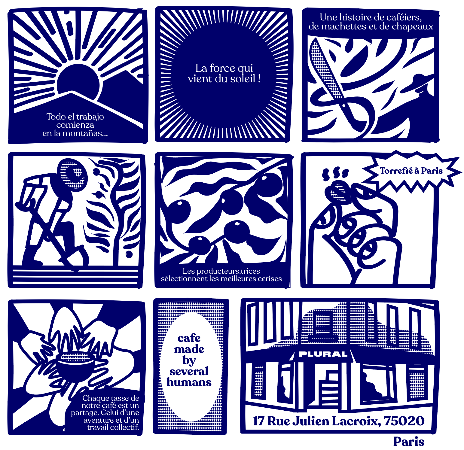 Nous sommes ravis de vous présenter notre tout dernier t-shirt de lancement, spécialement conçu pour célébrer l'ouverture de notre nouveau coffee shop dans le 20ème arrondissement de Paris. Cette pièce unique raconte de manière captivante le parcours du café, depuis la ferme jusqu'à votre tasse. Notre design s'inspire des bandes dessinées, de la couleur bleu foncé traditionnelle, et incarne un concept global qui véhicule notre esprit collaboratif.